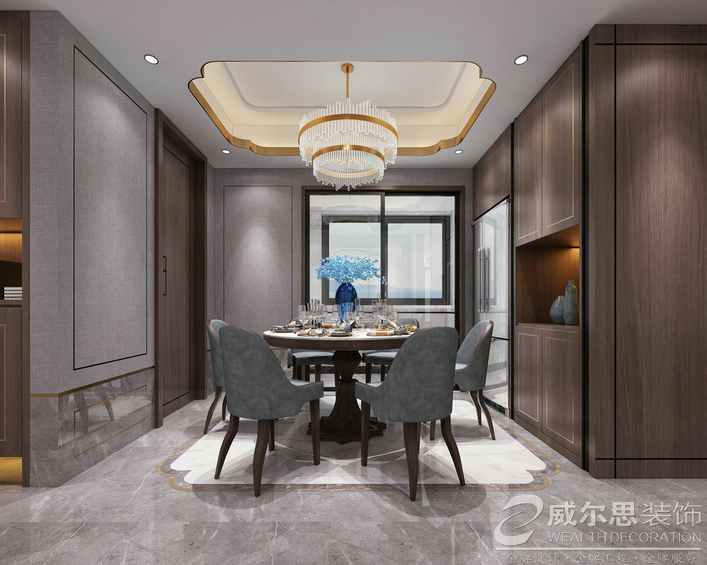 餐廳:視線自然過渡道餐廳,餐廳的設(shè)計兼容了宴客禮儀和人文情懷,在灰色的基調(diào)中,璀璨的水晶吊燈 灑下溫馨的光景。吊頂與地面相呼應(yīng),餐桌采用圓桌,寓意“圓方互融”家庭和睦美滿,最好的祝福從來都不用述說,設(shè)計師的別具匠心,全在房子的一磚一瓦之間。